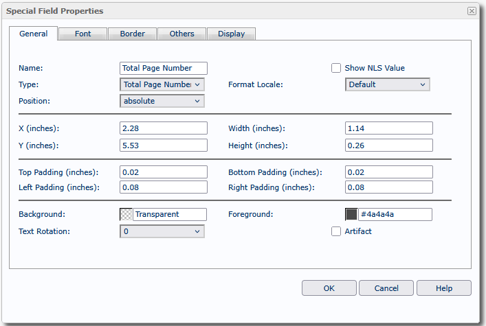 You can use the Special Field Properties dialog box to edit the properties of a special field. This topic describes the properties in the dialog box.