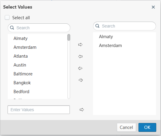 This topic describes how you can use the Select values dialog box to set the current selected value for filter control.
