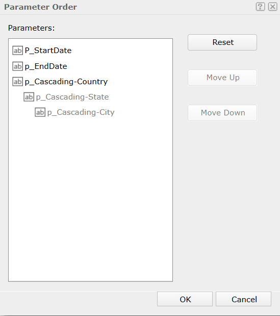 You can use the Parameter Order dialog to adjust the display sequence of the parameters in the UI for specifying parameter values at report level. This topic describes the options in the dialog box.